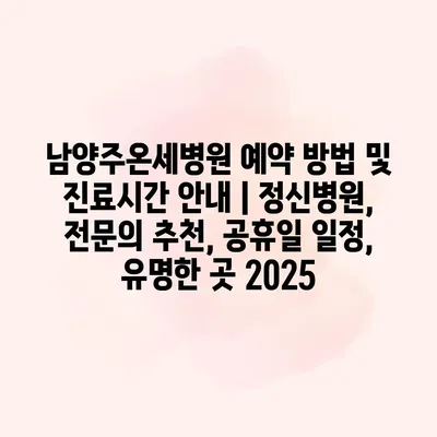 남양주온세병원 예약 방법 및 진료시간 공지 | 정신병원, 전연락 추천, 공휴일 일정, 유명한 곳 2025 남양주온세병원은 정신건강을 위한 전문 의료 기관으로, 다양한 진료 서비스를 알려알려드리겠습니다.… 더 보기 »남양주온세병원 예약 방법 및 진료시간 안내 | 정신병원, 전문의 추천, 공휴일 일정, 유명한 곳 2025
