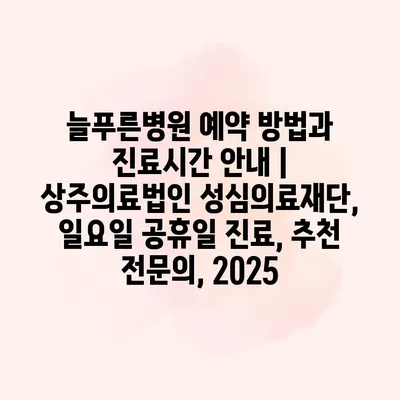 늘푸른병원 예약 방법과 진료시간 공지 | 상주의료법인 성심의료재단, 일요일 공휴일 진료, 추천 전연락, 2025에 대한 정보입니다. 늘푸른병원은 전화 예약, 온라인 예약 시스템을 통해 편리하게 진료를… 더 보기 »늘푸른병원 예약 방법과 진료시간 안내 | 상주의료법인 성심의료재단, 일요일 공휴일 진료, 추천 전문의, 2025
