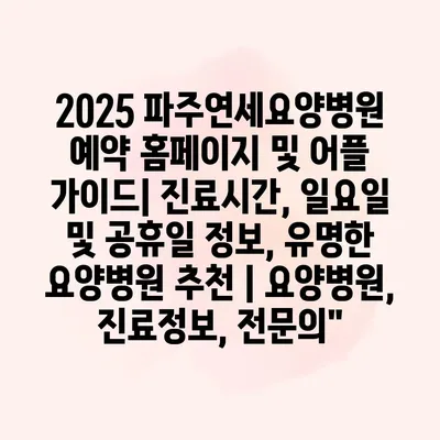 2025 파주연세요양병원 예약 홈페이지 및 어플 설명서를 통해 손쉽게 진료 예약을 할 수 있습니다. 이 병원은 전문적인 요양 치료와 함께, 환자의 편안함을 최우선으로 합니다. 진료시간은… 더 보기 »2025 파주연세요양병원 예약 홈페이지 및 어플 가이드| 진료시간, 일요일 및 공휴일 정보, 유명한 요양병원 추천 | 요양병원, 진료정보, 전문의”