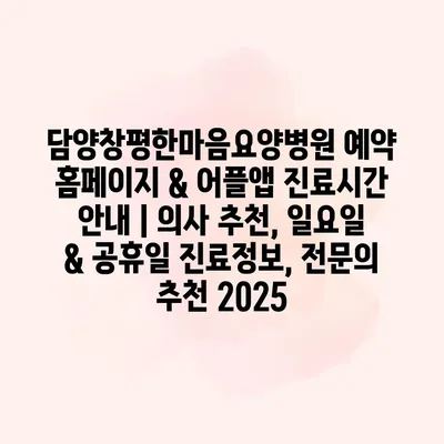 담양창평한마음요양병원 예약 홈페이지 & 어플앱 진료시간 공지는 환자 여러분의 편의를 위한 다양한 내용을 알려알려드리겠습니다. 어플리케이션을 통해 언제 어디서나 빠른 예약이 가능하며, 진료 시간도 쉽게 확인할… 더 보기 »담양창평한마음요양병원 예약 홈페이지 & 어플앱 진료시간 안내 | 의사 추천, 일요일 & 공휴일 진료정보, 전문의 추천 2025