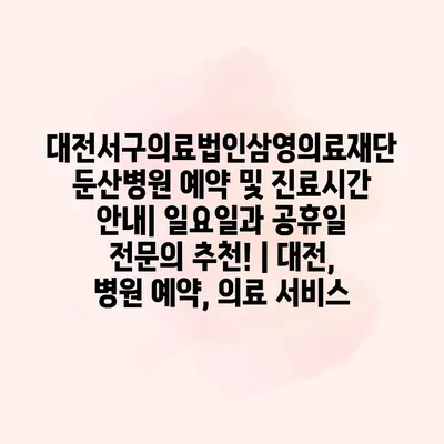 대전서구의료법인삼영의료재단 둔산병원은 신뢰할 수 있는 의료 서비스를 알려알려드리겠습니다. 예약 및 진료시간 공지는 매우 중요한 정보입니다. 병원은 평일 오전 9시부터 오후 6시까지 진료를 하며, 토요일은 오전… 더 보기 »대전서구의료법인삼영의료재단 둔산병원 예약 및 진료시간 안내| 일요일과 공휴일 전문의 추천! | 대전, 병원 예약, 의료 서비스