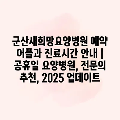 군산새희망요양병원 예약 어플과 진료시간 공지에 대해 알아보겠습니다. 군산새희망요양병원은 환자분들의 편의를 위해 온라인 예약 어플을 알려알려드리겠습니다. 이 어플리케이션을 통해 빠르고 간편하게 예약을 할 수 있으며, 진료시간도… 더 보기 »군산새희망요양병원 예약 어플과 진료시간 안내 | 공휴일 요양병원, 전문의 추천, 2025 업데이트