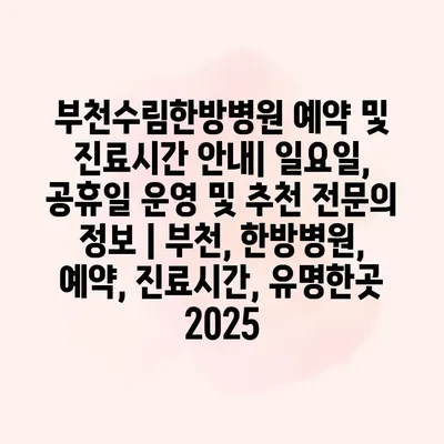 부천수림한방병원은 예약 및 진료시간에 대한 내용을 알려드려 환자들이 보다 편리하게 진료를 받을 수 있도록 돕고 있습니다. 저희 병원은 평일에는 오전 9시부터 오후 6시까지 진료를 진행하며,… 더 보기 »부천수림한방병원 예약 및 진료시간 안내| 일요일, 공휴일 운영 및 추천 전문의 정보 | 부천, 한방병원, 예약, 진료시간, 유명한곳 2025