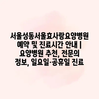 서울성동서울효사랑요양병원 예약 및 진료시간 공지 서울성동서울효사랑요양병원은 전문적인 노인 의료 서비스를 제공하는 요양병원입니다. 병원은 매일 운영되며, 평일은 오전 9시부터 오후 5시까지 진료를 진행합니다. 주말과 일요일·공휴일에도 진료가… 더 보기 »서울성동서울효사랑요양병원 예약 및 진료시간 안내 | 요양병원 추천, 전문의 정보, 일요일·공휴일 진료