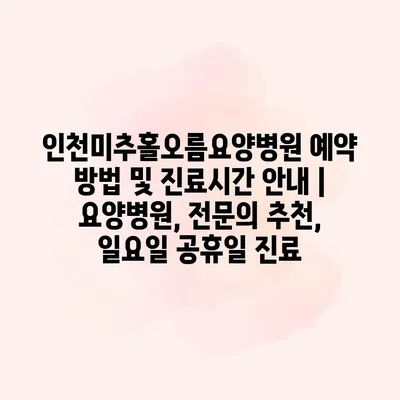 인천미추홀오름요양병원 예약 방법 및 진료시간 공지 인천미추홀오름요양병원은 편리한 예약 시스템으로 환자분들이 쉽게 진료를 받을 수 있도록 돕고 있습니다. 예약은 전화나 방문을 통해 할 수 있습니다.… 더 보기 »인천미추홀오름요양병원 예약 방법 및 진료시간 안내 | 요양병원, 전문의 추천, 일요일 공휴일 진료