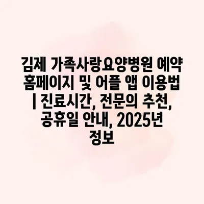 김제 가족사랑요양병원 예약 홈페이지 및 어플 앱 이용법에 대해 공지제공합니다. 환자분들께서는 홈페이지 또는 앱을 통해 간편하게 예약할 수 있습니다. 예약 절차는 매우 직관적이며, 필수 내용을… 더 보기 »김제 가족사랑요양병원 예약 홈페이지 및 어플 앱 이용법 | 진료시간, 전문의 추천, 공휴일 안내, 2025년 정보