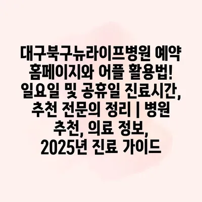 대구북구뉴라이프병원 예약 홈페이지와 어플 활용법! 이 병원은 현대적이고 편리한 예약 시스템을 알려드려 진료를 더욱 쉽게 받을 수 있습니다. 홈페이지에 접속하면 예약 페이지로 이동할 수 있으며,… 더 보기 »대구북구뉴라이프병원 예약 홈페이지와 어플 활용법! 일요일 및 공휴일 진료시간, 추천 전문의 정리 | 병원 추천, 의료 정보, 2025년 진료 가이드