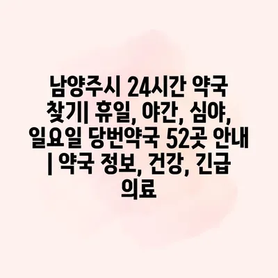 남양주시에서 24시간 약국을 찾는 것은 건강을 지키고 긴급 상황에 대처하는 데 매우 중요합니다. 휴일이나 야간에도 불구하고 약이 필요할 때, 적시에 약국을 찾을 수 있는 정보가… 더 보기 »남양주시 24시간 약국 찾기| 휴일, 야간, 심야, 일요일 당번약국 52곳 안내 | 약국 정보, 건강, 긴급 의료