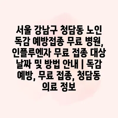 서울 강남구 청담동에서 노인 독감 예방접종을 무료로 제공하는 병원에 대한 정보입니다. 겨울철이 다가오면서 인플루엔자가 발생할 위험이 높아지는 시점입니다. 특히 노인분들은 면역력이 저하되어 감염에 취약하므로, 적절한… 더 보기 »서울 강남구 청담동 노인 독감 예방접종 무료 병원, 인플루엔자 무료 접종 대상 날짜 및 방법 안내 | 독감 예방, 무료 접종, 청담동 의료 정보