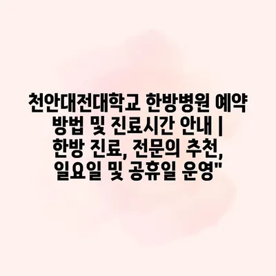 천안대전대학교 한방병원은 전통적인 한방 치료를 통해 건강을 회복할 수 있는 곳입니다. 예약 방법은 간단합니다. 병원 홈페이지를 통해 온라인 예약이 가능하며, 전화 예약도 할 수 있습니다.… 더 보기 »천안대전대학교 한방병원 예약 방법 및 진료시간 안내 | 한방 진료, 전문의 추천, 일요일 및 공휴일 운영”