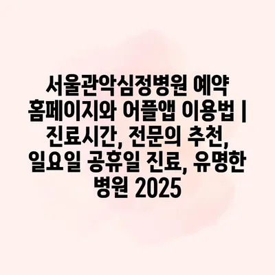 서울관악심정병원 예약 홈페이지와 어플앱 이용법을 소개합니다. 이 병원의 예약 시스템은 사용하기 간편하여 빠른 진료를 도와줍니다. 먼저, 홈페이지에 접속하거나 어플을 다운로드한 후 회원 가입을 통해 로그인합니다.… 더 보기 »서울관악심정병원 예약 홈페이지와 어플앱 이용법 | 진료시간, 전문의 추천, 일요일 공휴일 진료, 유명한 병원 2025