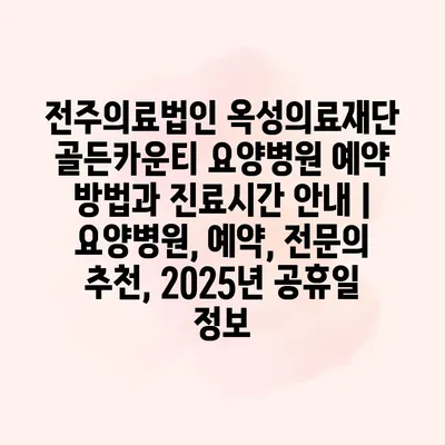 전주의료법인 옥성의료재단 골든카운티 요양병원은 전문적인 요양 서비스를 알려알려드리겠습니다. 예약 방법은 간단합니다. 전화 또는 온라인을 통해 편리하게 예약하실 수 있습니다. 전화 예약은 병원 대표번호로 전화하시면 됩니다.… 더 보기 »전주의료법인 옥성의료재단 골든카운티 요양병원 예약 방법과 진료시간 안내 | 요양병원, 예약, 전문의 추천, 2025년 공휴일 정보