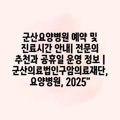 군산요양병원 예약 및 진료시간 공지| 전연락 추천과 공휴일 운영 정보 | 군산의료법인구암의료재단, 요양병원, 2025 군산요양병원은 전연락와의 상담으로 환자 맞춤형 진료를 알려알려드리겠습니다. 예약 시스템을 통해 빠르고… 더 보기 »군산요양병원 예약 및 진료시간 안내| 전문의 추천과 공휴일 운영 정보 | 군산의료법인구암의료재단, 요양병원, 2025″