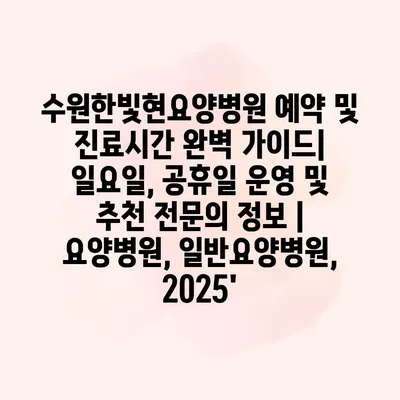 수원한빛현요양병원 예약 및 진료시간 완벽 설명서| 일요일, 공휴일 운영 및 추천 전연락 정보 | 요양병원, 일반요양병원, 2025 수원한빛현요양병원은 다양한 요양 서비스를 제공하며, 예약 시스템을 통해… 더 보기 »수원한빛현요양병원 예약 및 진료시간 완벽 가이드| 일요일, 공휴일 운영 및 추천 전문의 정보 | 요양병원, 일반요양병원, 2025′