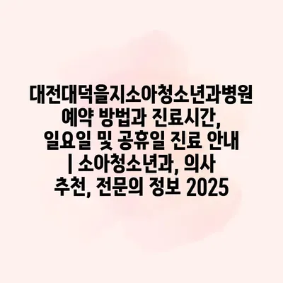 대전대덕을지소아청소년과병원은 소아 및 청소년의 건강을 전문으로 다루는 병원으로, 안전하고 신뢰할 수 있는 진료를 알려알려드리겠습니다. 예약 방법은 간단하며, 병원 공식 웹사이트나 전화로 쉽게 할 수 있습니다.… 더 보기 »대전대덕을지소아청소년과병원 예약 방법과 진료시간, 일요일 및 공휴일 진료 안내 | 소아청소년과, 의사 추천, 전문의 정보 2025
