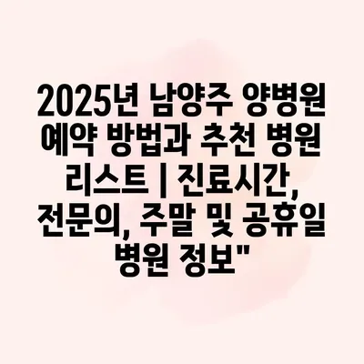 2025년 남양주 양병원 예약 방법과 추천 병원 리스트 | 진료시간, 전연락, 주말 및 공휴일 병원 정보 남양주에서 건강관리를 소홀히 할 수 없습니다. 양병원 예약 방법을… 더 보기 »2025년 남양주 양병원 예약 방법과 추천 병원 리스트 | 진료시간, 전문의, 주말 및 공휴일 병원 정보”