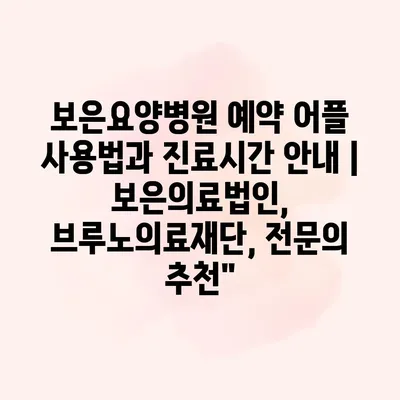보은요양병원 예약 어플 사용법과 진료시간 공지는 환자와 보호자에게 큰 도움이 되는 정보입니다. 이 어플을 사용하면 간편하게 진료 예약을 할 수 있으며, 대기 시간을 줄일 수… 더 보기 »보은요양병원 예약 어플 사용법과 진료시간 안내 | 보은의료법인, 브루노의료재단, 전문의 추천”