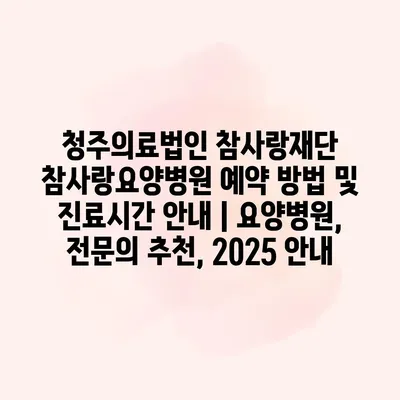 청주의료법인 참사랑재단의 참사랑요양병원에 대한 예약 방법과 진료시간 공지를 알려알려드리겠습니다. 우선, 예약 방법은 전화나 온라인을 통해 가능하며, 원하는 날짜와 시간을 미리 조율할 수 있습니다. 전화 예약은… 더 보기 »청주의료법인 참사랑재단 참사랑요양병원 예약 방법 및 진료시간 안내 | 요양병원, 전문의 추천, 2025 안내