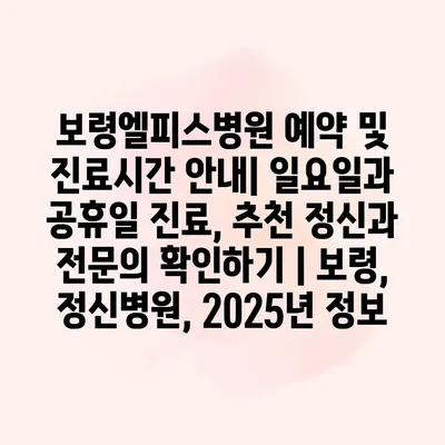 보령엘피스병원 예약 및 진료시간 공지| 일요일과 공휴일 진료, 추천 정신과 전연락 확인하기 | 보령, 정신병원, 2025년 정보 보령엘피스병원은 정신과 치료에 특화된 병원으로, 지역 주민들에게 안정적인… 더 보기 »보령엘피스병원 예약 및 진료시간 안내| 일요일과 공휴일 진료, 추천 정신과 전문의 확인하기 | 보령, 정신병원, 2025년 정보