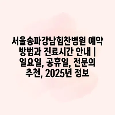 서울송파강남힘찬병원은 고객 친화적인 예약 방법을 알려드려 편리한 진료를 지원합니다. 예약은 전화, 홈페이지, 모바일 앱을 통해 할 수 있습니다. 체계적인 시스템 덕분에 원하는 시간에 손쉽게 예약할… 더 보기 »서울송파강남힘찬병원 예약 방법과 진료시간 안내 | 일요일, 공휴일, 전문의 추천, 2025년 정보
