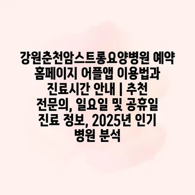 강원춘천암스트롱요양병원 예약 홈페이지와 앱은 사용자가 쉽게 접속하여 예약을 할 수 있도록 도와줍니다. 홈페이지나 앱에 접속 후, 원하는 진료과를 선택하고 의사 선생님의 일정을 확인하여 편리하게 예약할… 더 보기 »강원춘천암스트롱요양병원 예약 홈페이지 어플앱 이용법과 진료시간 안내 | 추천 전문의, 일요일 및 공휴일 진료 정보, 2025년 인기 병원 분석