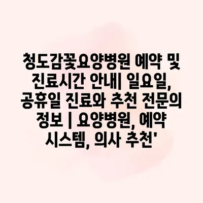청도감꽃요양병원 예약 및 진료시간 공지는 환자분들께 중요한 정보입니다. 저희 병원에서는 정확하고 효율적인 예약 시스템을 통해 환자분들의 불편을 최소화하고 있습니다. 환자분들은 전화 또는 온라인을 통해 쉽고… 더 보기 »청도감꽃요양병원 예약 및 진료시간 안내| 일요일, 공휴일 진료와 추천 전문의 정보 | 요양병원, 예약 시스템, 의사 추천’