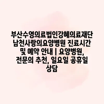부산수영의료법인강혜의료재단 남천사랑의요양병원에서는 환자 여러분을 위해 최상의 진료 서비스를 제공하고 있습니다. 우리 병원의 진료시간은 월요일부터 토요일까지 오전 9시부터 오후 5시까지이며, 일요일 및 공휴일에는 휴무입니다. 진료를 원하시는… 더 보기 »부산수영의료법인강혜의료재단 남천사랑의요양병원 진료시간 및 예약 안내 | 요양병원, 전문의 추천, 일요일 공휴일 상담