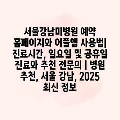 서울강남미병원 예약 홈페이지와 어플앱 사용법을 알아보겠습니다. 예약 홈페이지와 어플을 통해 간편하게 진료 예약을 진행할 수 있습니다. 사용자는 회원가입 후 로그인하여 원하는 진료 과목과 전연락를 선택하면… 더 보기 »서울강남미병원 예약 홈페이지와 어플앱 사용법| 진료시간, 일요일 및 공휴일 진료와 추천 전문의 | 병원 추천, 서울 강남, 2025 최신 정보