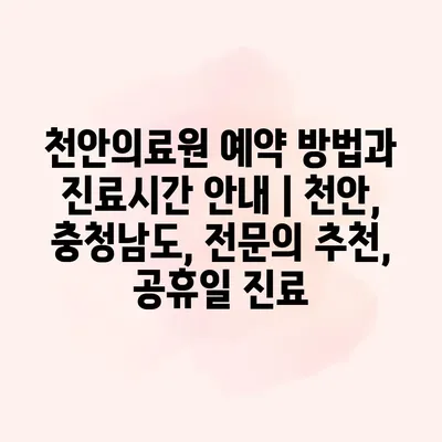 천안의료원은 환자 중심의 진료 서비스를 제공하고 있습니다. 예약 방법은 간편하며, 전화 또는 온라인을 통해 할 수 있습니다. 방문하기 전 미리 예약을 하시면 더욱 원활한 진료를… 더 보기 »천안의료원 예약 방법과 진료시간 안내 | 천안, 충청남도, 전문의 추천, 공휴일 진료