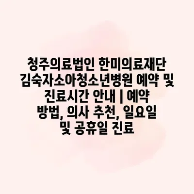 청주의료법인 한미의료재단 김숙자소아청소년병원은 안전하고 믿을 수 있는 소아청소년 진료를 알려알려드리겠습니다. 병원은 월요일부터 금요일까지 오전 9시부터 오후 6시까지 진료를 실시하며, 토요일은 오전 9시부터 오후 1시까지 운영합니다.… 더 보기 »청주의료법인 한미의료재단 김숙자소아청소년병원 예약 및 진료시간 안내 | 예약 방법, 의사 추천, 일요일 및 공휴일 진료