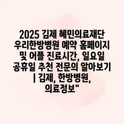 2025 김제 혜민의료재단 우리한방병원 예약 홈페이지 및 어플 진료시간, 일요일 공휴일 추천 전연락 알아보기 | 김제, 한방병원, 의료정보 김제 지역에서 한방 치료를 고민하고 계신다면, 혜민의료재단… 더 보기 »2025 김제 혜민의료재단 우리한방병원 예약 홈페이지 및 어플 진료시간, 일요일 공휴일 추천 전문의 알아보기 | 김제, 한방병원, 의료정보”