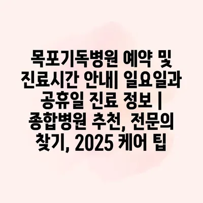 목포기독병원 예약 및 진료시간 공지는 환자들에게 중요한 정보입니다. 목포기독병원은 평일 진료를 비롯하여 일요일과 공휴일에도 진료 서비스를 알려알려드리겠습니다. 환자들이 간편하게 진료를 받을 수 있도록 운영시간을 공지제공합니다.… 더 보기 »목포기독병원 예약 및 진료시간 안내| 일요일과 공휴일 진료 정보 | 종합병원 추천, 전문의 찾기, 2025 케어 팁
