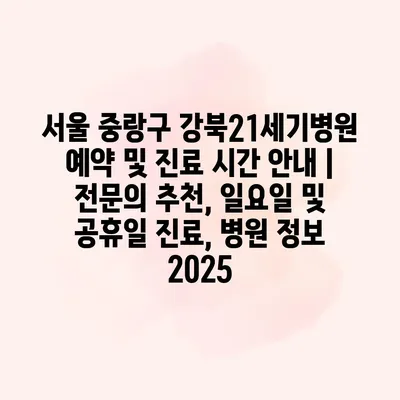 서울 중랑구 강북21세기병원 예약 및 진료 시간 안내 | 전문의 추천, 일요일 및 공휴일 진료, 병원 정보 2025 강북21세기병원은 서울 중랑구에 위치하여 지역 주민들에게 중요한… 더 보기 »서울 중랑구 강북21세기병원 예약 및 진료 시간 안내 | 전문의 추천, 일요일 및 공휴일 진료, 병원 정보 2025