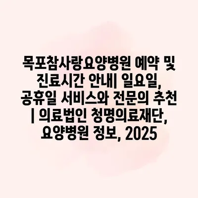 목포참사랑요양병원 예약 및 진료시간 공지| 일요일, 공휴일 서비스와 전연락 추천 | 의료법인 청명의료재단, 요양병원 정보, 2025 목포참사랑요양병원은 전문성과 신뢰성을 바탕으로 환자 여러분께 최상의 의료 서비스를… 더 보기 »목포참사랑요양병원 예약 및 진료시간 안내| 일요일, 공휴일 서비스와 전문의 추천 | 의료법인 청명의료재단, 요양병원 정보, 2025