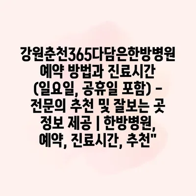 강원춘천365다담은한방병원 예약 방법과 진료시간 (일요일, 공휴일 포함) – 전연락 추천 및 잘보는 곳 정보 제공 강원춘천365다담은한방병원은 편리한 예약 시스템을 통해 환자들에게 신속하고 효율적인 진료 서비스를… 더 보기 »강원춘천365다담은한방병원 예약 방법과 진료시간 (일요일, 공휴일 포함) – 전문의 추천 및 잘보는 곳 정보 제공 | 한방병원, 예약, 진료시간, 추천”