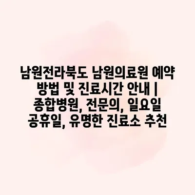 남원전라북도 남원의료원은 지역 주민들에게 다양한 의료 서비스를 제공하는 종합병원입니다. 예약 방법은 간편한데, 전화나 온라인 예약 시스템을 통해 할 수 있습니다. 전화 예약은 병원 고객센터에 직접… 더 보기 »남원전라북도 남원의료원 예약 방법 및 진료시간 안내 | 종합병원, 전문의, 일요일 공휴일, 유명한 진료소 추천