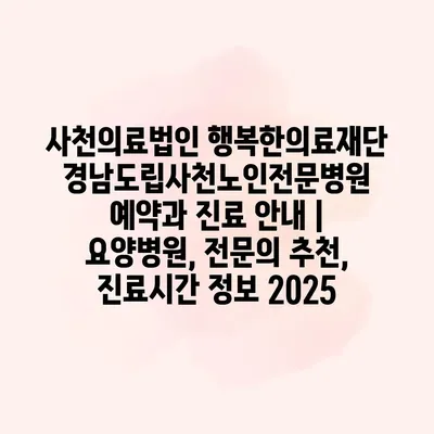 사천의료법인 행복한의료재단 경남도립사천노인전문병원 예약과 진료 안내 | 요양병원, 전문의 추천, 진료시간 정보 2025