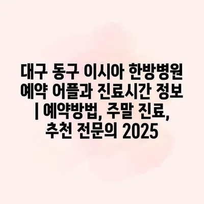대구 동구 이시아 한방병원은 예약 어플을 통해 쉽고 편리하게 진료를 받을 수 있는 곳입니다. 어플을 사용하면 간편하게 예약방법을 선택할 수 있어, 대기 시간 없이 방문할… 더 보기 »대구 동구 이시아 한방병원 예약 어플과 진료시간 정보 | 예약방법, 주말 진료, 추천 전문의 2025