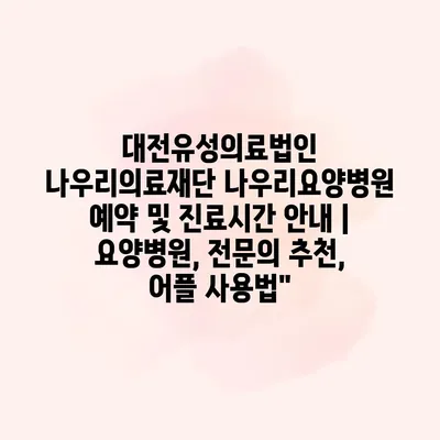 대전유성의료법인 나우리의료재단 나우리요양병원은 다양한 진료서비스를 제공하며, 예약 및 진료시간 공지를 통해 환자분들이 보다 편리하게 이용할 수 있도록 돕고 있습니다. 요양병원에 대한 연락는 종종 많은 분들이… 더 보기 »대전유성의료법인 나우리의료재단 나우리요양병원 예약 및 진료시간 안내 | 요양병원, 전문의 추천, 어플 사용법”