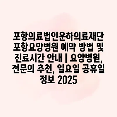 포항의료법인운하의료재단 포항요양병원 예약 방법 및 진료시간 공지 | 요양병원, 전연락 추천, 일요일 공휴일 정보 2025 포항요양병원에서 진료를 받고자 하는 경우, 예약 방법을 알아두는 것이 중요합니다.… 더 보기 »포항의료법인운하의료재단 포항요양병원 예약 방법 및 진료시간 안내 | 요양병원, 전문의 추천, 일요일 공휴일 정보 2025