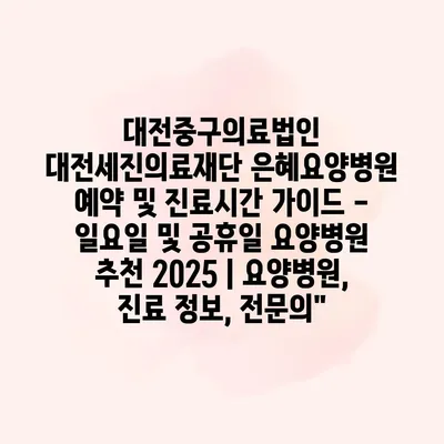 대전중구의료법인 대전세진의료재단 은혜요양병원 예약 및 진료시간 설명서 – 일요일 및 공휴일 요양병원 추천 2025에 대해 소개합니다. 특히 일요일 및 공휴일에도 운영되는 요양병원이 필요하신 분들에게 유용한… 더 보기 »대전중구의료법인 대전세진의료재단 은혜요양병원 예약 및 진료시간 가이드 – 일요일 및 공휴일 요양병원 추천 2025 | 요양병원, 진료 정보, 전문의”