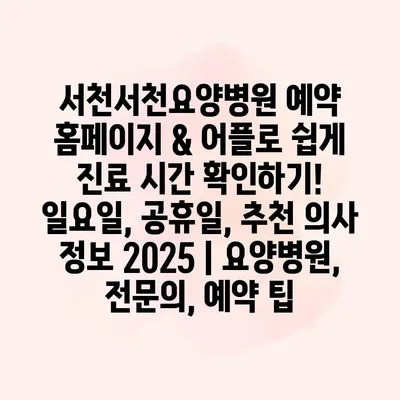 서천서천요양병원 예약 홈페이지 & 어플로 쉽게 진료 시간 확인하기! 일요일, 공휴일, 추천 의사 정보 2025 | 요양병원, 전문의, 예약 팁