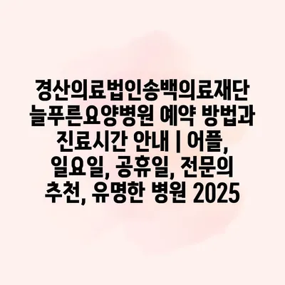 경산의료법인송백의료재단 늘푸른요양병원은 환자 중심의 진료를 제공하는 유명한 요양병원입니다. 예약 방법은 간편하게 어플리케이션을 통해 진행할 수 있으며, 전화 예약도 할 수 있습니다. 진료 시간은 평일 오전… 더 보기 »경산의료법인송백의료재단 늘푸른요양병원 예약 방법과 진료시간 안내 | 어플, 일요일, 공휴일, 전문의 추천, 유명한 병원 2025