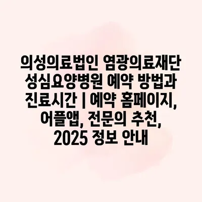 의성의료법인 염광의료재단 성심요양병원 예약 방법과 진료시간에 대한 내용을 공지합니다. 성심요양병원은 통합적인 의료서비스를 제공하며, 예약은 매우 간편하게 이루어집니다. 먼저, 병원 공식 예약 홈페이지를 통해 쉽게 예약할… 더 보기 »의성의료법인 염광의료재단 성심요양병원 예약 방법과 진료시간 | 예약 홈페이지, 어플앱, 전문의 추천, 2025 정보 안내