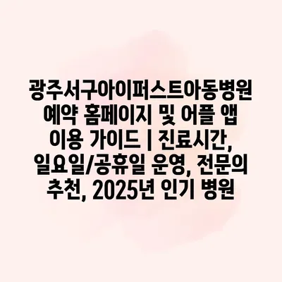 광주서구아이퍼스트아동병원 예약 홈페이지 및 어플 앱 이용 설명서를 소개합니다. 이 병원은 전문 아동 의료 서비스를 제공하며, 예약 시스템을 통해 간편하게 진료를 받으실 수 있습니다. 진료시간은… 더 보기 »광주서구아이퍼스트아동병원 예약 홈페이지 및 어플 앱 이용 가이드 | 진료시간, 일요일/공휴일 운영, 전문의 추천, 2025년 인기 병원