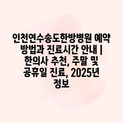 인천연수송도한방병원 예약 방법과 진료시간 공지 이 병원은 한방 진료를 전문으로 하며, 환자들에게 편리한 예약 시스템을 알려알려드리겠습니다. 예약은 전화나 병원 홈페이지를 통해 가능하며, 통화 연결 후… 더 보기 »인천연수송도한방병원 예약 방법과 진료시간 안내 | 한의사 추천, 주말 및 공휴일 진료, 2025년 정보