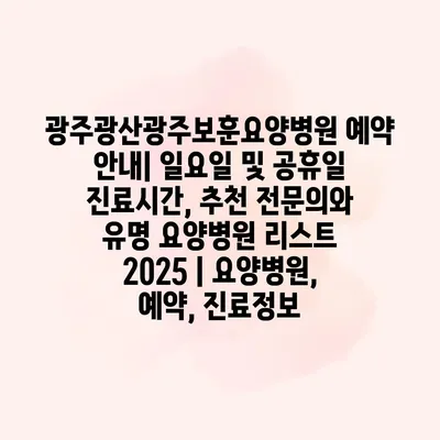 광주광산광주보훈요양병원 예약 공지입니다. 저희 병원은 환자분들의 편리한 진료를 위해 구성된 다양한 예약 시스템을 운영하고 있습니다. 일요일 및 공휴일에도 진료를 알려드려, 언제든지 필요한 의료 서비스를 받을… 더 보기 »광주광산광주보훈요양병원 예약 안내| 일요일 및 공휴일 진료시간, 추천 전문의와 유명 요양병원 리스트 2025 | 요양병원, 예약, 진료정보