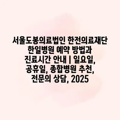 서울도봉의료법인 한전의료재단 한일병원 예약 방법과 진료시간 공지에 대해 알아보겠습니다. 한일병원은 다양한 전연락와 최상의 의료 서비스를 제공하는 종합병원입니다. 병원에 방문하시기 전, 반드시 예약을 하시는 것이 좋습니다.… 더 보기 »서울도봉의료법인 한전의료재단 한일병원 예약 방법과 진료시간 안내 | 일요일, 공휴일, 종합병원 추천, 전문의 상담, 2025