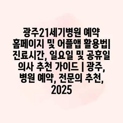 광주21세기병원 예약 홈페이지 및 어플앱 활용법| 진료시간, 일요일 및 공휴일 의사 추천 설명서 | 광주, 병원 예약, 전연락 추천, 2025 광주21세기병원의 예약 시스템은 매우 간편하고… 더 보기 »광주21세기병원 예약 홈페이지 및 어플앱 활용법| 진료시간, 일요일 및 공휴일 의사 추천 가이드 | 광주, 병원 예약, 전문의 추천, 2025