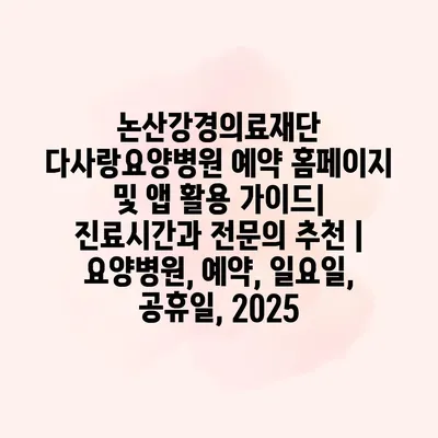 논산강경의료재단 다사랑요양병원 예약 홈페이지 및 앱 활용 설명서| 진료시간과 전연락 추천 | 요양병원, 예약, 일요일, 공휴일, 2025 논산강경의료재단 다사랑요양병원은 효율적인 예약 시스템을 알려드려 환자들에게 편리한… 더 보기 »논산강경의료재단 다사랑요양병원 예약 홈페이지 및 앱 활용 가이드| 진료시간과 전문의 추천 | 요양병원, 예약, 일요일, 공휴일, 2025